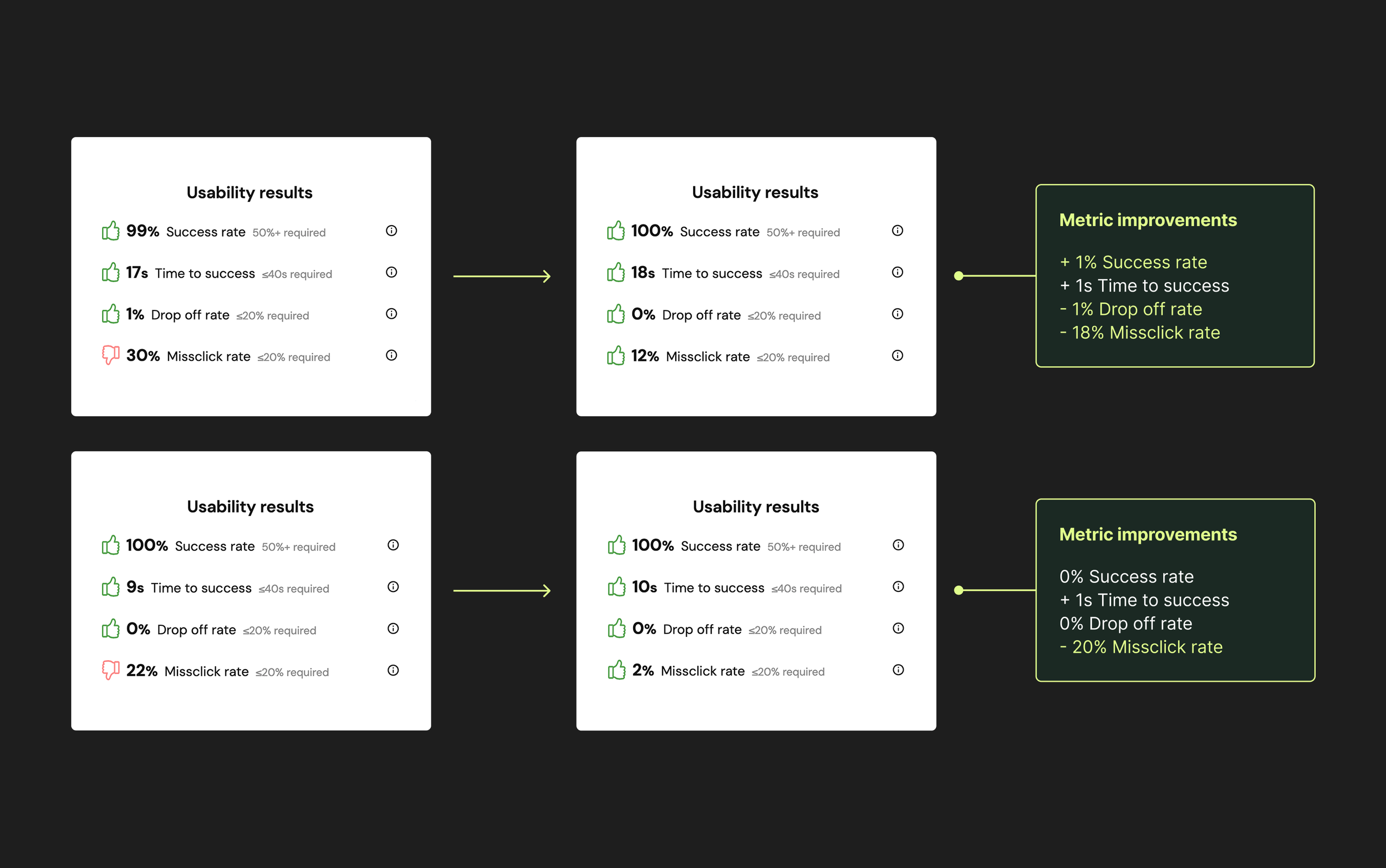 The simulation results and human testing informed small but meaningful refinements, including clearer copy and reducing the onboarding flow by one full step. These changes improved success rates and time to success, while reducing misclicks and drop-off rates.