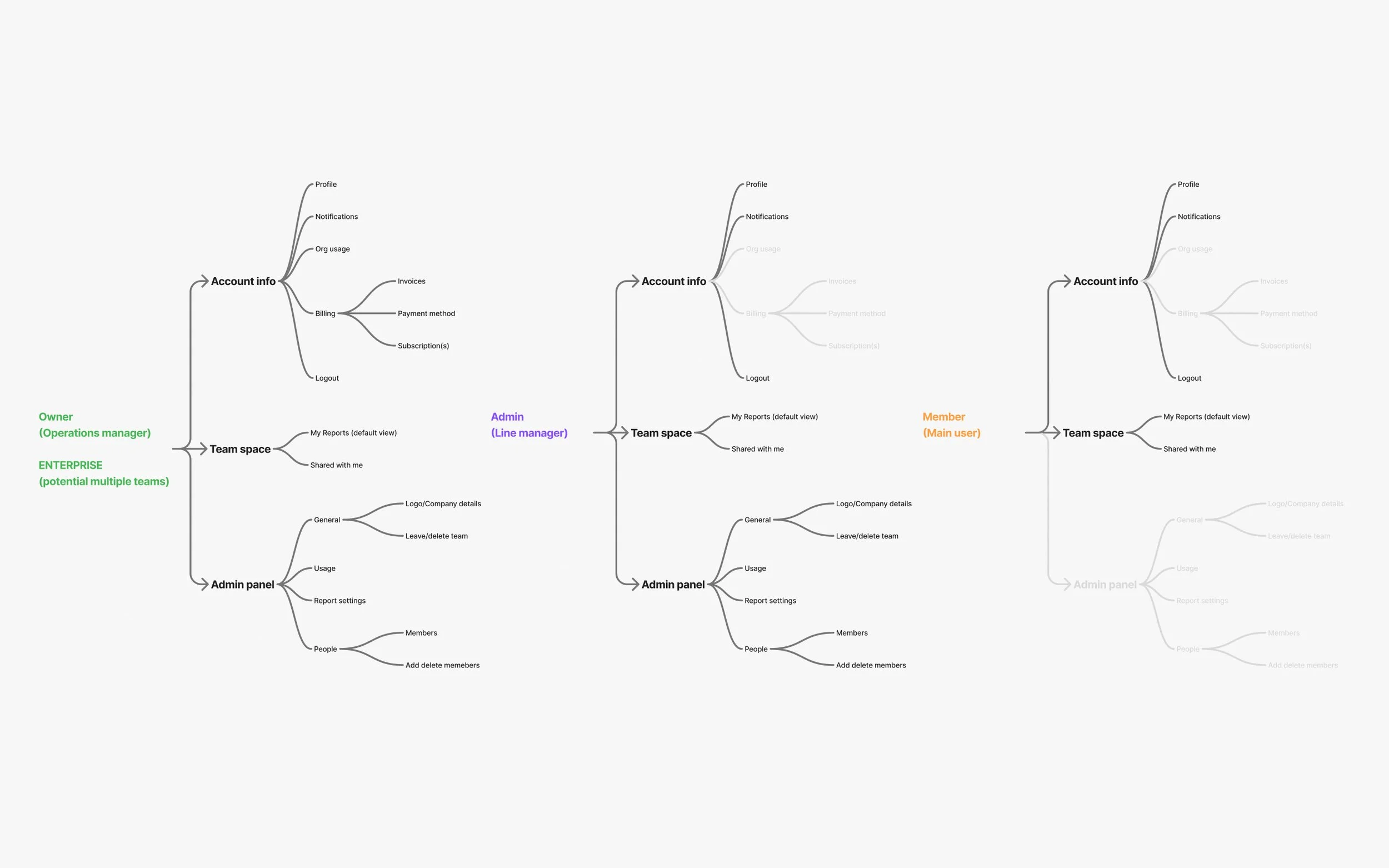 I mapped the information architecture for the workspace to understand how all the core areas fit together, including settings, billing, and member management, and how access changes by user role.